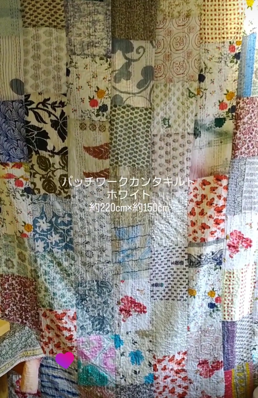 シルクの様々な生地がパッチワークされた見ているだけで楽しくなる素敵なカンタキルト。